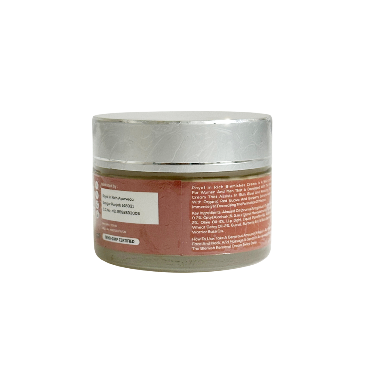 Royal In Rich Blemishes Cream is a gentle yet powerful Ayurvedic skincare formula designed to reduce dark spots, lighten pigmentation, and fade stubborn blemishes. Enriched with herbal extracts, it helps repair damaged skin, restore natural glow, and even out skin tone without causing irritation. Its chemical-free formulation makes it safe for daily use.