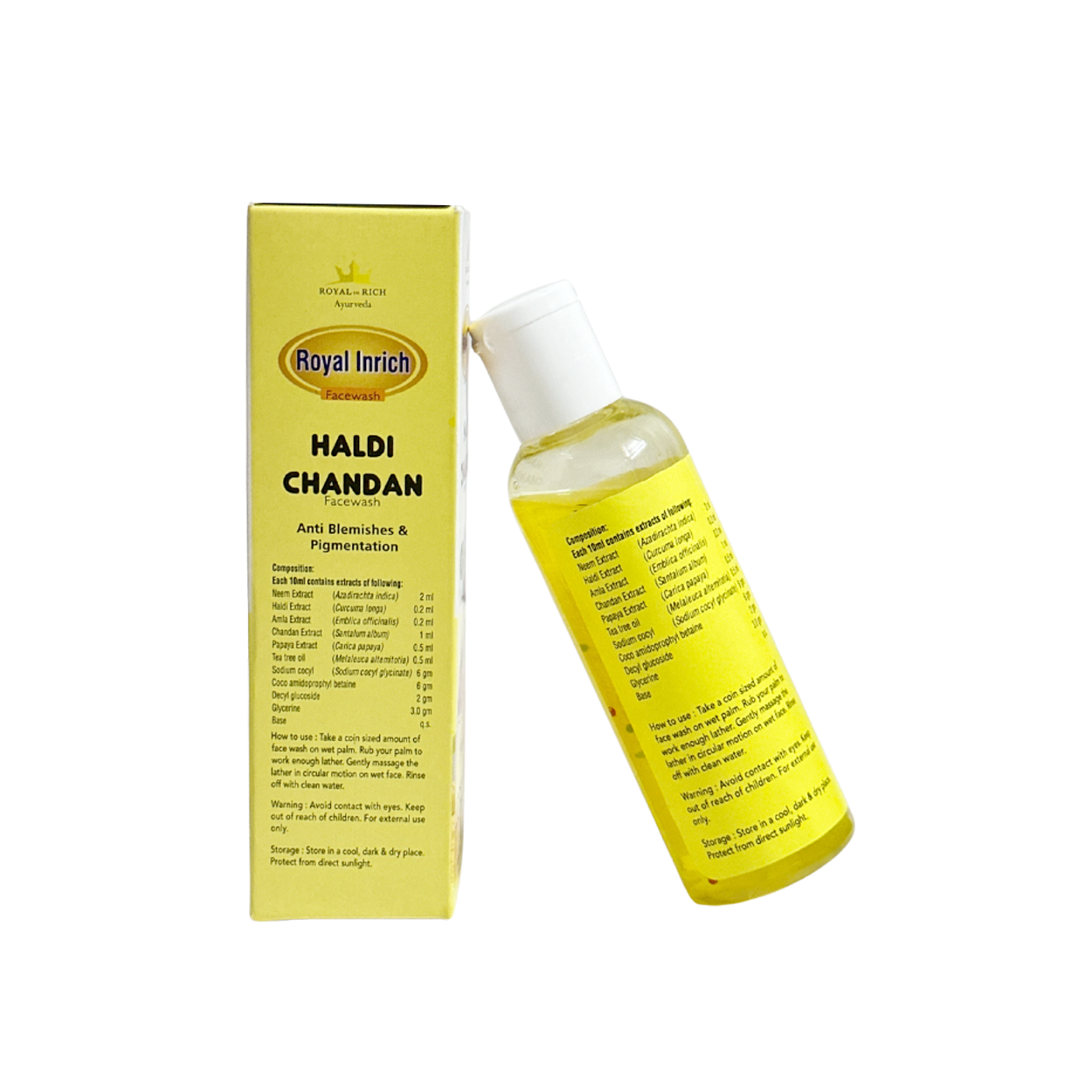 Royal Inrich Haldi Chandan Facewash is a traditional Ayurvedic cleansing formula enriched with the purifying power of Haldi and the soothing essence of Chandan. This facewash helps cleanse deeply, reduce blemishes, lighten pigmentation, and enhance natural radiance. Its calming fragrance and gentle texture make it ideal for everyday skincare, leaving skin fresh, bright, and even-toned.